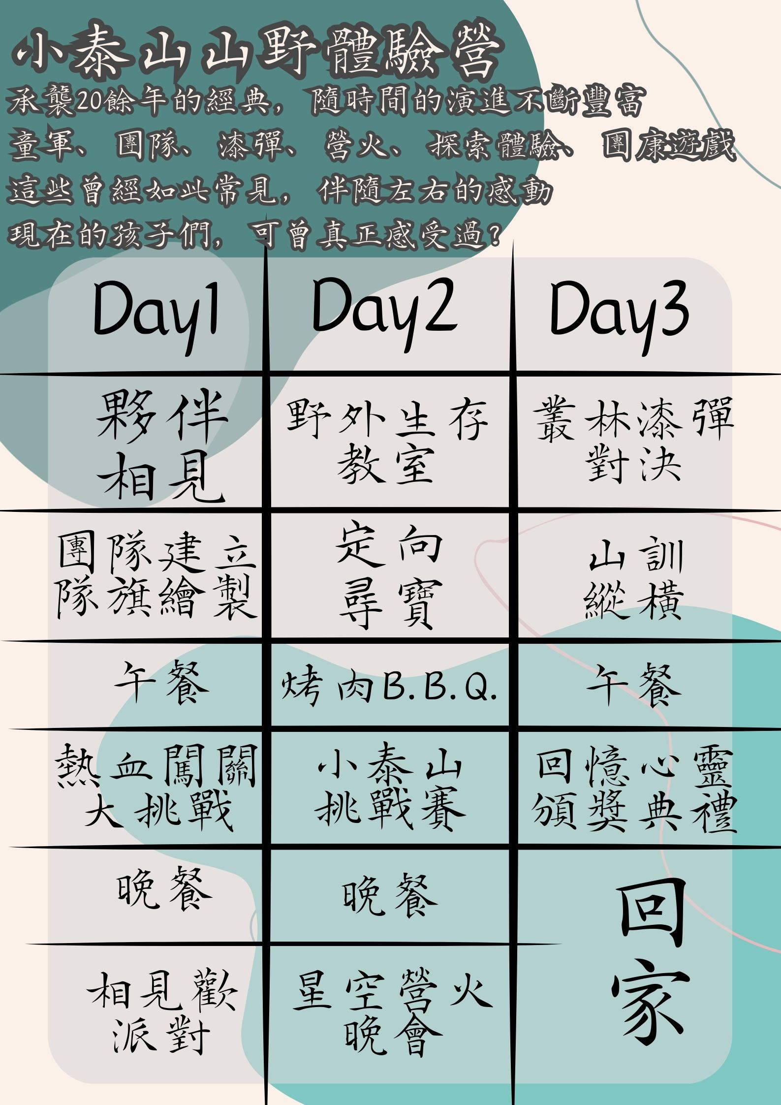 是一場專為孩子打造的自然探索之旅,讓他們遠離3C,親近山林,在大自然中快樂成長。我們精心設計多元戶外體驗活動,包括小泰山勇士闖關挑戰、漆彈射擊與森林大地遊戲,讓孩子在冒險中學習團隊合作與挑戰自我。同時,透過童軍教育融入急救包紮、繩結教學與野外求生技巧,提升孩子的獨立思考與生活技能。最令人期待的經典營火晚會,在熱情舞蹈與歡笑聲中,孩子們將建立深厚友誼,收穫滿滿成長回憶。這不只是一次宿營,更是讓孩子擺脫科技束縛、擁抱大自然,做個無憂無慮的小泰山,享受最純真的暑假時光!