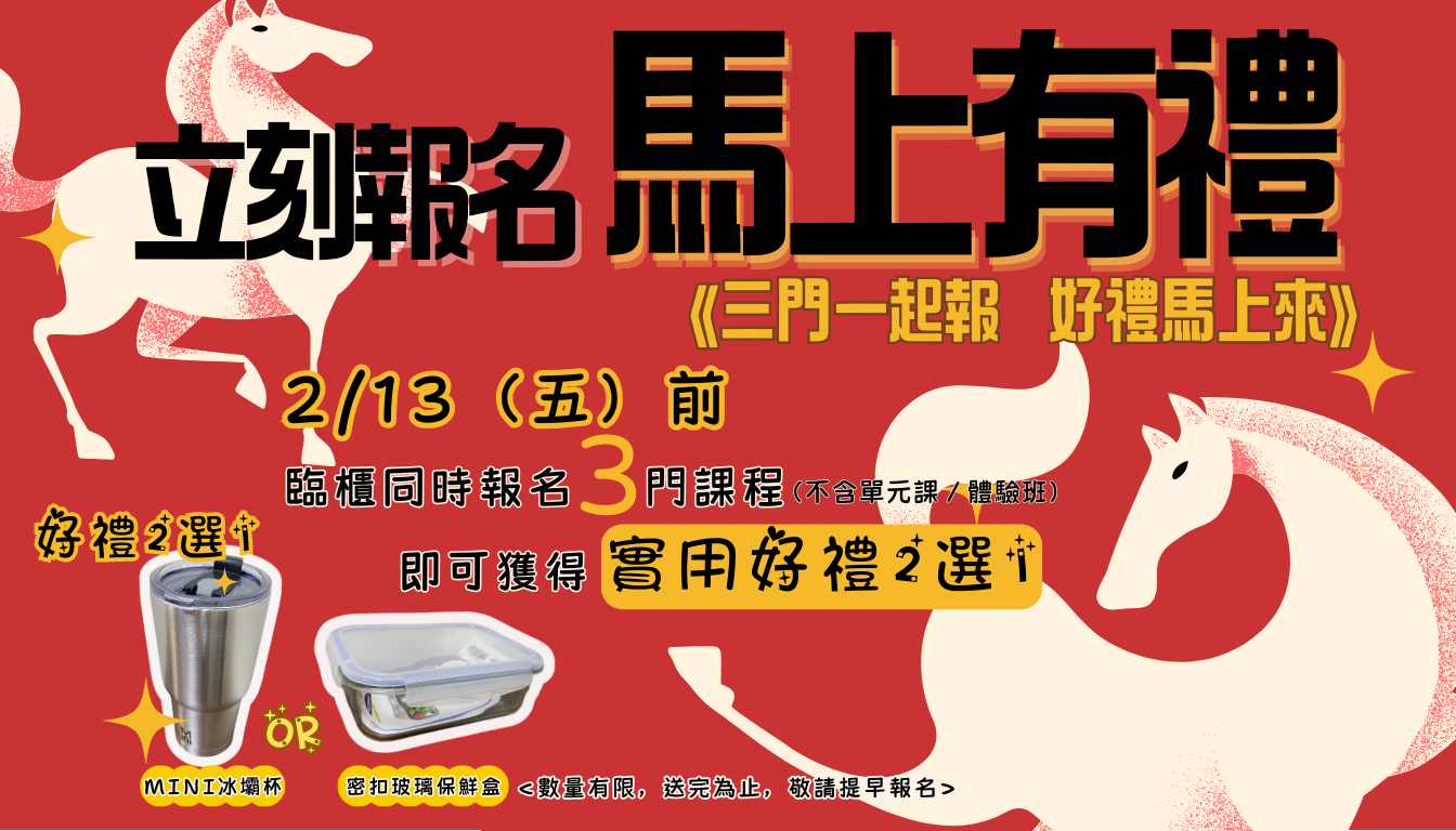 ☆新春限定☆--2/13(五)前,一人临柜报名三门课程,即送好礼!!(送完为止)